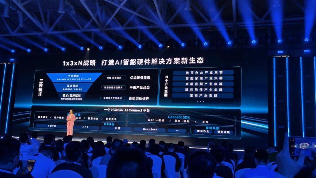 方飞表示,“1”代表HONOR AI Connect平台,作为整个生态的技术底座,该平台将荣耀的AI核心能力向生态伙伴全面开放;“3”指的是针对合作伙伴的生态赋能、渠道赋能、技术与品牌赋能三大扶持模式;“N”则代表AI终端覆盖领域,包括教育办公、智能家居、音频穿戴、宠物健康、潮玩陪伴等多个产业集群,目标是实现全场景智能覆盖。