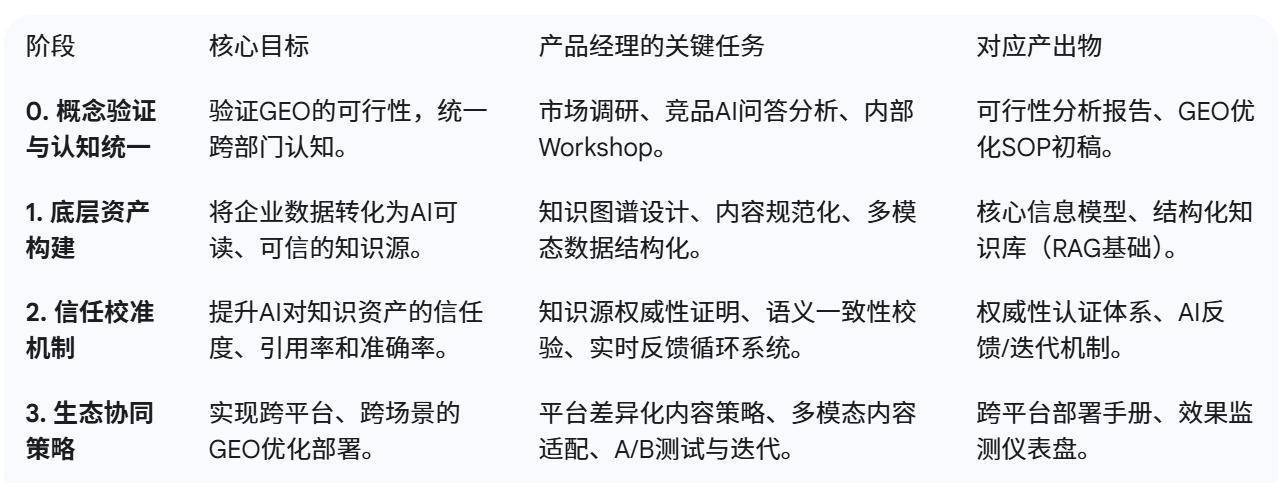 2.1 阶段一:底层资产构建——从网站到知识图谱SEO关注的是HTML标签、链接结构;GEO关注的是“知识”的结构和质量。这一阶段,产品经理需要像一位“知识建筑师”。