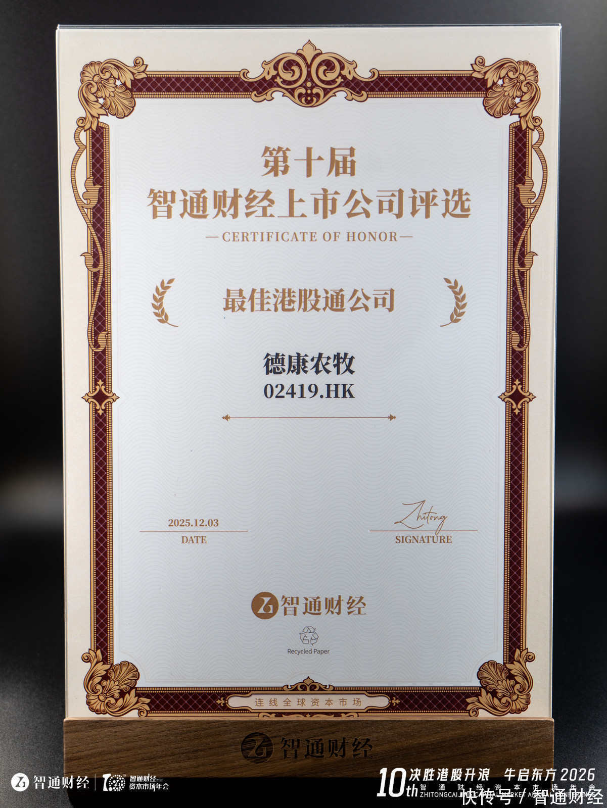 在“第十届智通财经上市公司颁奖盛典”上,德康农牧(02419)获评“最佳港股通公司”大奖。自2016年智通财经首次举办上市公司评选活动以来,行至第十届,现已成为港美股领域最具规模与影响力的年度盛事。作为国内全产业链畜禽养殖龙头企业,德康农牧凭借其领先的行业地位、扎实的公司治理、稳健的经营基本面以及持续的投资者回报,首次夺得这一深具含金量的荣誉,充分彰显了资本市场对其长期价值与成长韧性的高度认可。