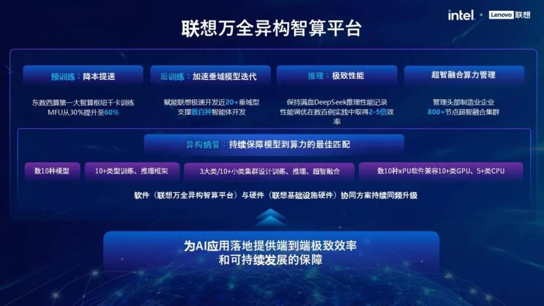 在核心算力调度层面,联想万全异构智算平台4.0完成预训练、后训练、推理及超智融合计算四大场景升级。该平台通过纳管数十类xPU与CPU优化异构算力协同,目前已在头部制造业接管超800节点的超智融合集群,支撑了近20个垂直领域模型的开发与数百种智能体应用的落地。